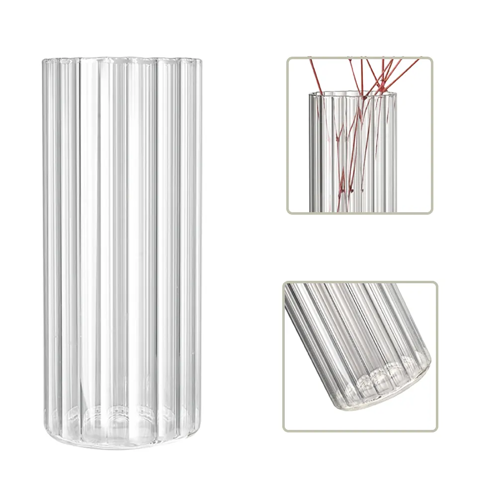Premium clear cylindrical glassware vases with vertical lines, perfect for decorators, retailers, and florists. Fast shipping and free samples available.