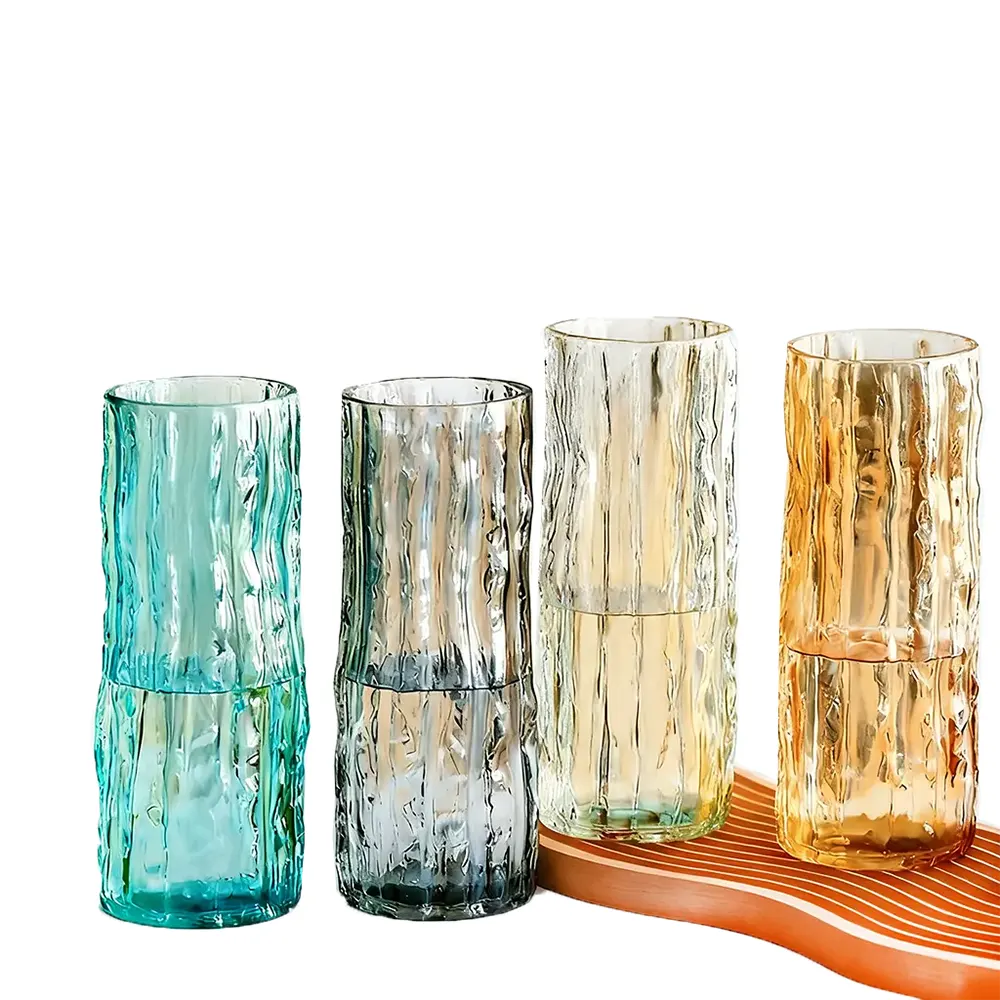 Elegante, transparente Glasvase mit unebener, strukturierter Oberfläche. Ideal für moderne Dekoration, Blumenarrangements und als einzigartige Vase im Großhandel. Kostenloses Muster.