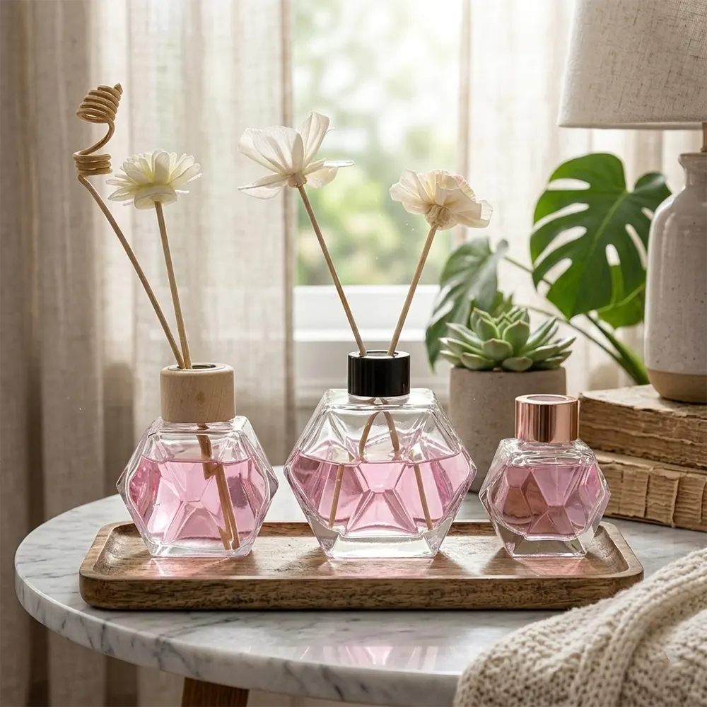 Una marca quería lanzar una línea de fragancias para el hogar de alta gama. Eligieron este difusor de varillas de 100 ml. Al renovar el vidrio a un suave color dorado y combinarlo con un tapón de metal pulido y varillas naturales, el difusor luce como una pieza decorativa de alta gama. Los minoristas lo elogian, y el difusor de cristal destaca en estanterías de regalos y exhibidores de spa. Sus pedidos B2B aumentaron un 80 % en cuatro meses. Esto se debe a que la botella transmite calidad incluso antes de que el cliente huela la fragancia.