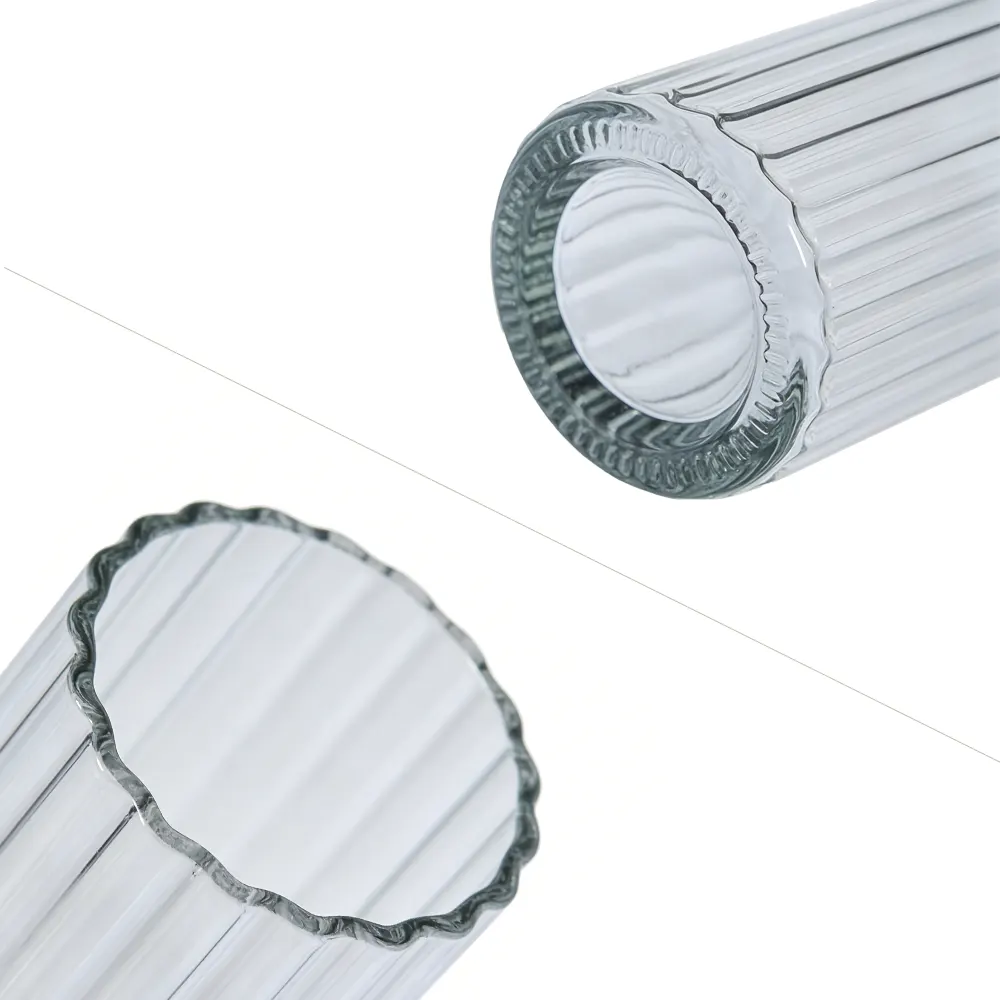 Przezroczysty, cylindryczny wazon z pionowymi paskami. Elegancki, duży wazon na kwiaty do domu, na imprezy lub do sprzedaży hurtowej. Skorzystaj z rabatów hurtowych, darmowych próbek i szybkiej dostawy.