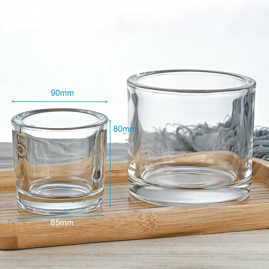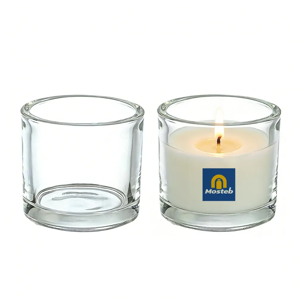 These small votive candle holders feature a clean cylindrical shape and thick transparent glass, designed as a versatile candle container for modern candle brands and home decor applications. This wide-mouth glass candle jar is a great size with the capacity of 275ml and allows a great viewing of the flame and wax therefore it is an ideal size to use in scented candles, decorative lighting and gift collection. These glass candle jars can be easily customized with minimalist style and smooth surface, and can be used as luxury candle jars, retail ready glass jars, or as versatile drinkwares like small whiskey glasses. These small candle jars are very popular in households, weddings, cafes, spas and party centers.